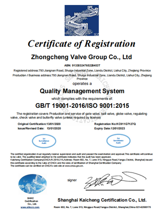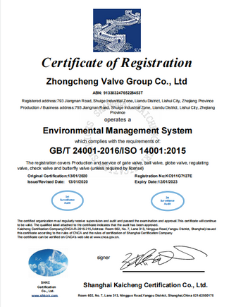Our company has obtained the environmental management system certificate GB/T24001-2016/iso14001:2015. It represents our safe environmental production. This certificate applies to gate valves, butterfly valves, ball valves, check valves and regulating valves